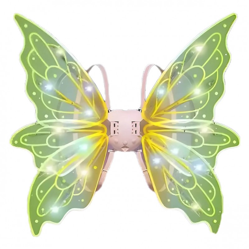 Με ενσωματωμένα φώτα LED, τα φτερά λάμπουν απαλά, δημιουργώντας ένα γοητευτικό οπτικό εφέ, ειδικά σε περιβάλλοντα με χαμηλό φωτισμό. Ο σχεδιασμός είναι ελαφρύς και άνετος, με ελαστικούς ιμάντες που προσαρμόζονται εύκολα στο σώμα του παιδιού.